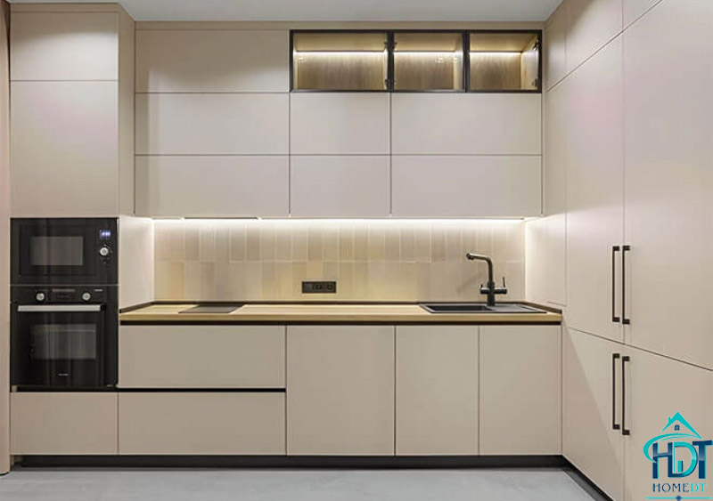 Tủ bếp MDF Melamine màu be sáng nhẹ nhàng